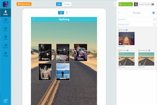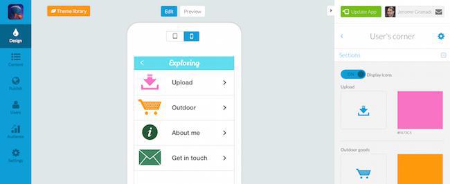 Dans un premier temps, vous êtes invité à choisir un mode de navigation. Voyez chaque mode de navigation comme une "porte d'entrée" vers les sous-sections de votre application. En fonction du style que vous voulez donner à cette "porte d'entrée", vous choisirez un mode de navigation dans lequel vous ajoutez votre propres images (comme dans l'exemple ci-dessus), ou bien un mode couleurs + icônes parmi les options disponibles (exemple ci-dessous).