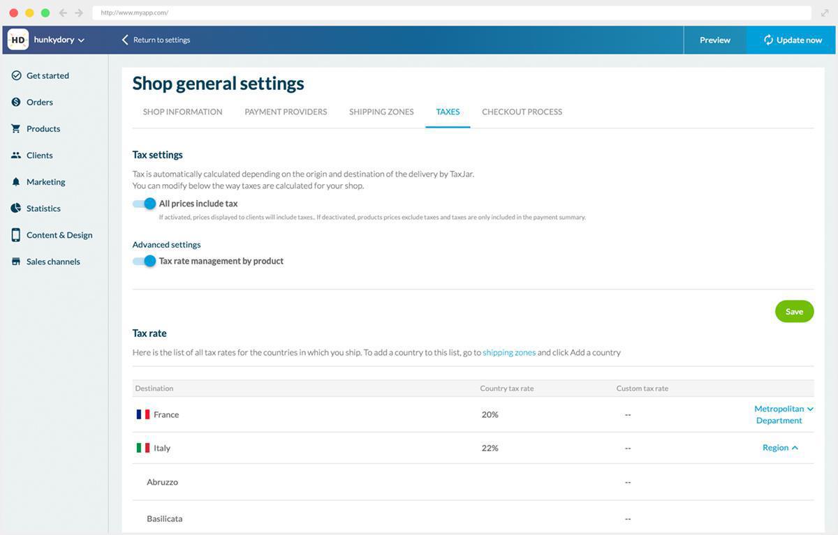 Dans le menu Paramètres > Paramètres de la boutique > Taxes, vous verrez maintenant pour (quasiment) tous les pays, un menu déroulant affichant les différentes régions, provinces, préfectures... Par exemple, comme vous pouvez le voir ci-dessous, en Italie, vous pouvez désormais personnaliser le taux de taxe pour chaque région.