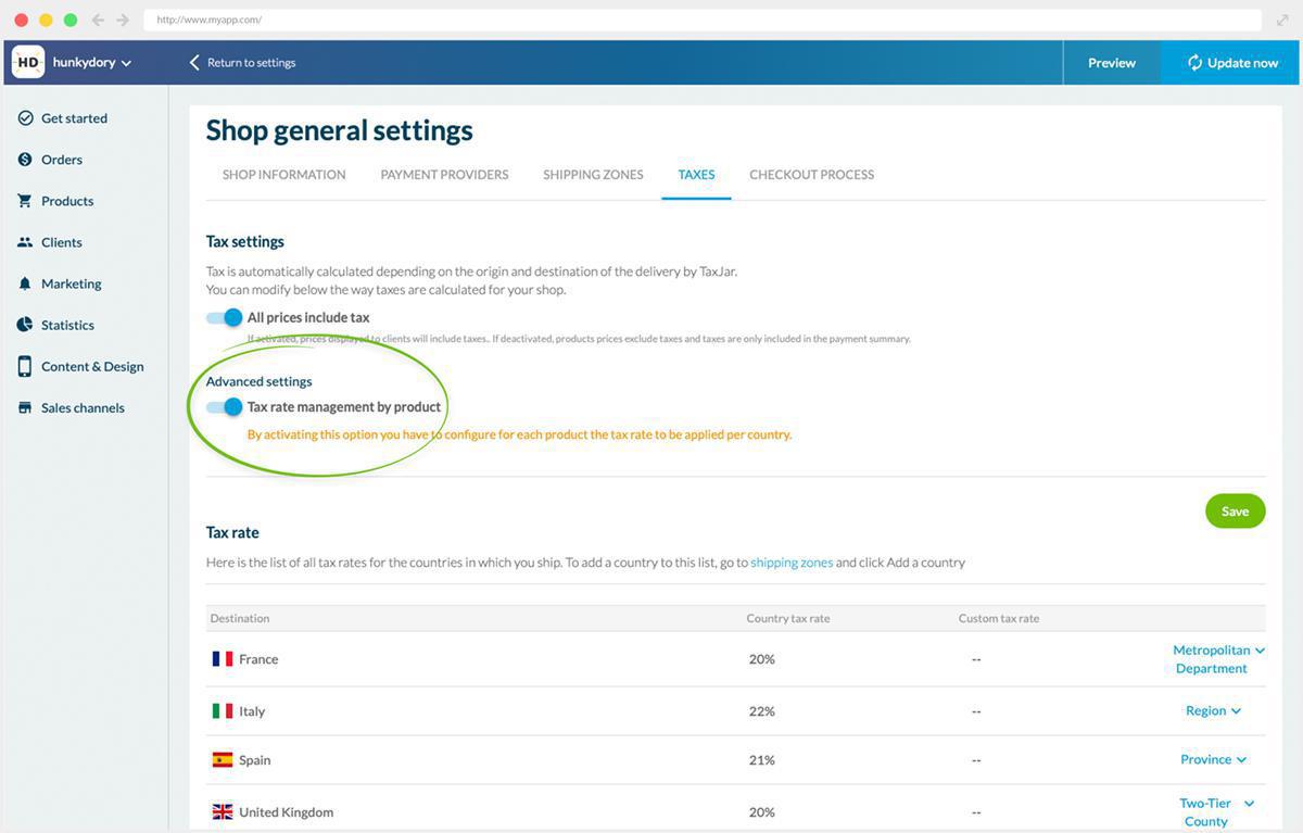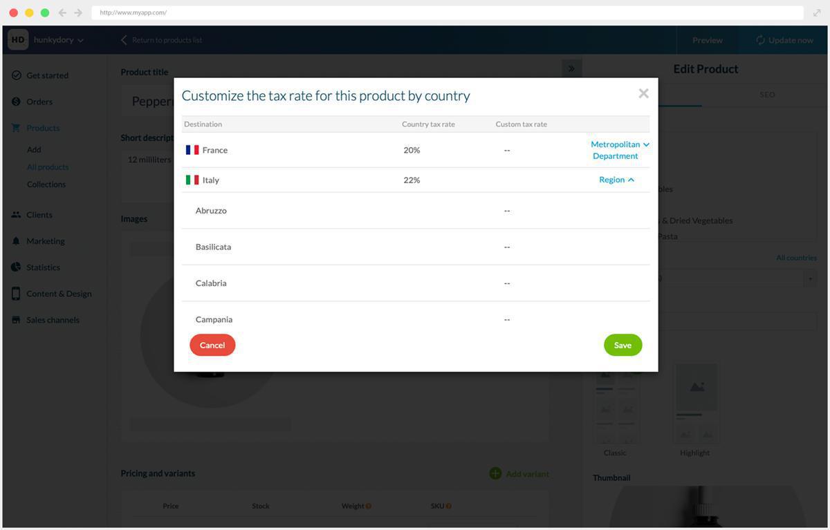 Grâce à vos commentaires sur le produit, nous avons ajouté des fonctionnalités avancées vous permettant de gérer des taux de taxes par produits et par régions en plus du taux générique du pays.