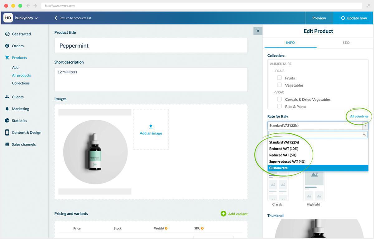- En Italie, les taux disponibles sont 22%, 10%, 5%, 4% ou un taux personnalisable.
