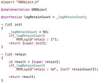 La mise en place de ce log est un peu plus complexe que les deux précédents. Nous avons du sous-classer un certain nombre d'objets natifs (NSObject, UIView, UIViewController, …) afin de redéfinir leurs fonctions mémoires (retain, release, init, dealloc). Ainsi, chaque fois qu'une de ces méthodes est appelées, un log indiquant le "retainCount" de l'objet est envoyé.