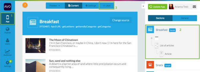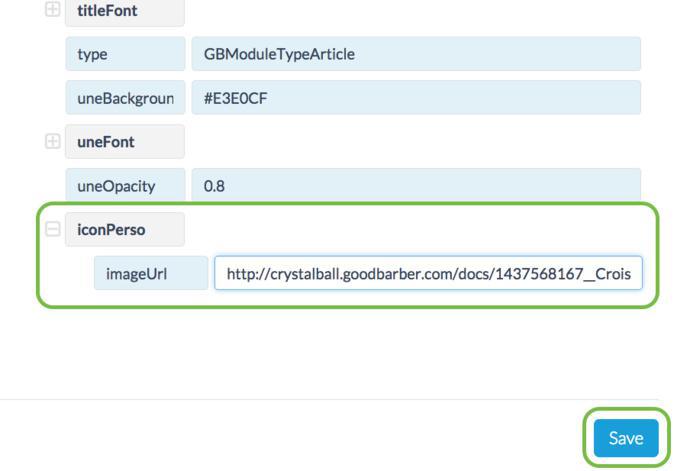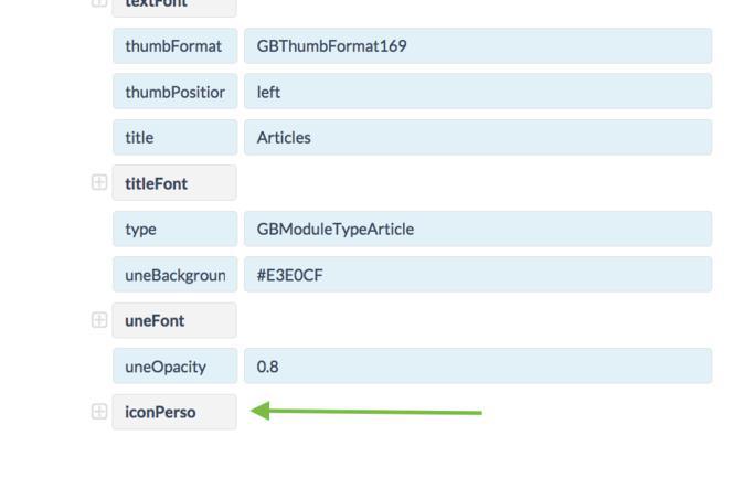 PS: Pour ajouter des icônes à toutes les sections de votre app, vous devrez recommencer ce processus dans le tableau de bord JSON de chaque section.