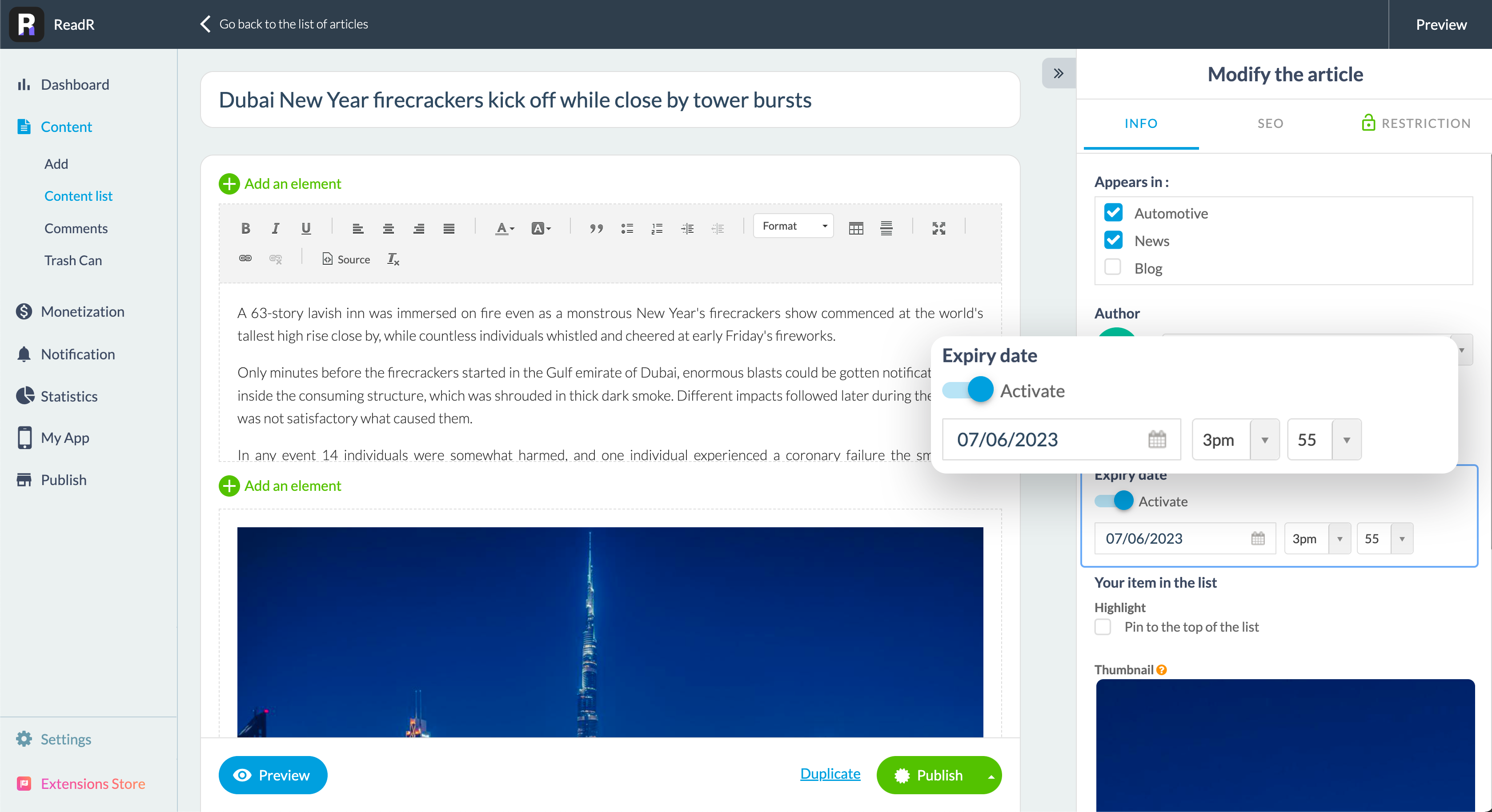 Dans le back-office de votre application, dans le menu Contenu > ajouter > sélectionnez le type de contenu que vous souhaitez ajouter (article, son, vidéo ou emplacement). Ici, nous utiliserons un article comme exemple. Dans le panneau latéral droit, sous l'onglet Info, vous trouverez un nouveau bloc permettant de planifier la fin d'une publication :