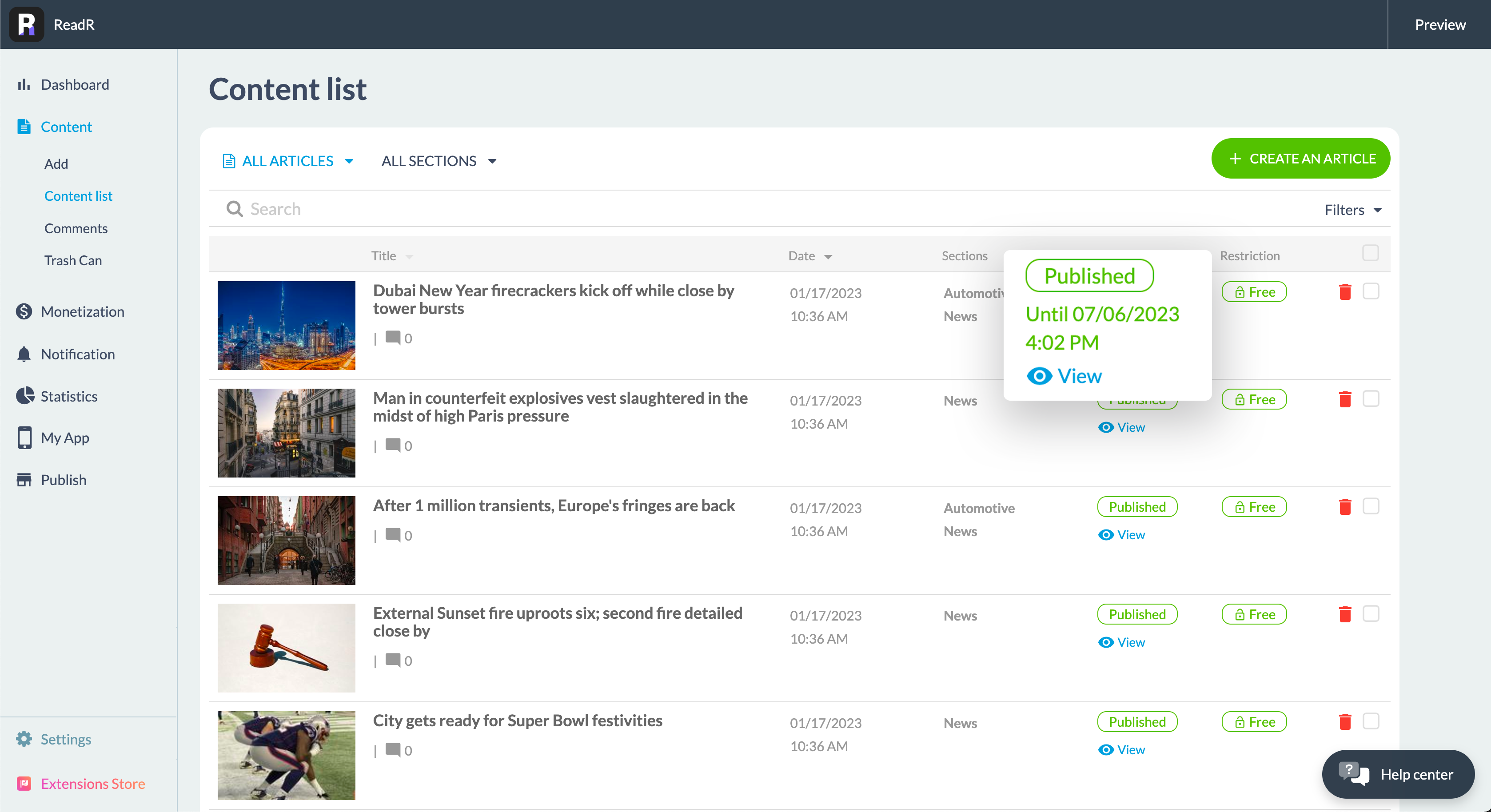 Dans le back-office de votre application, dans le menu Contenu > Liste des contenus, vous pouvez voir l'état de vos posts et leur date d'expiration lorsqu'elle est appliquée.