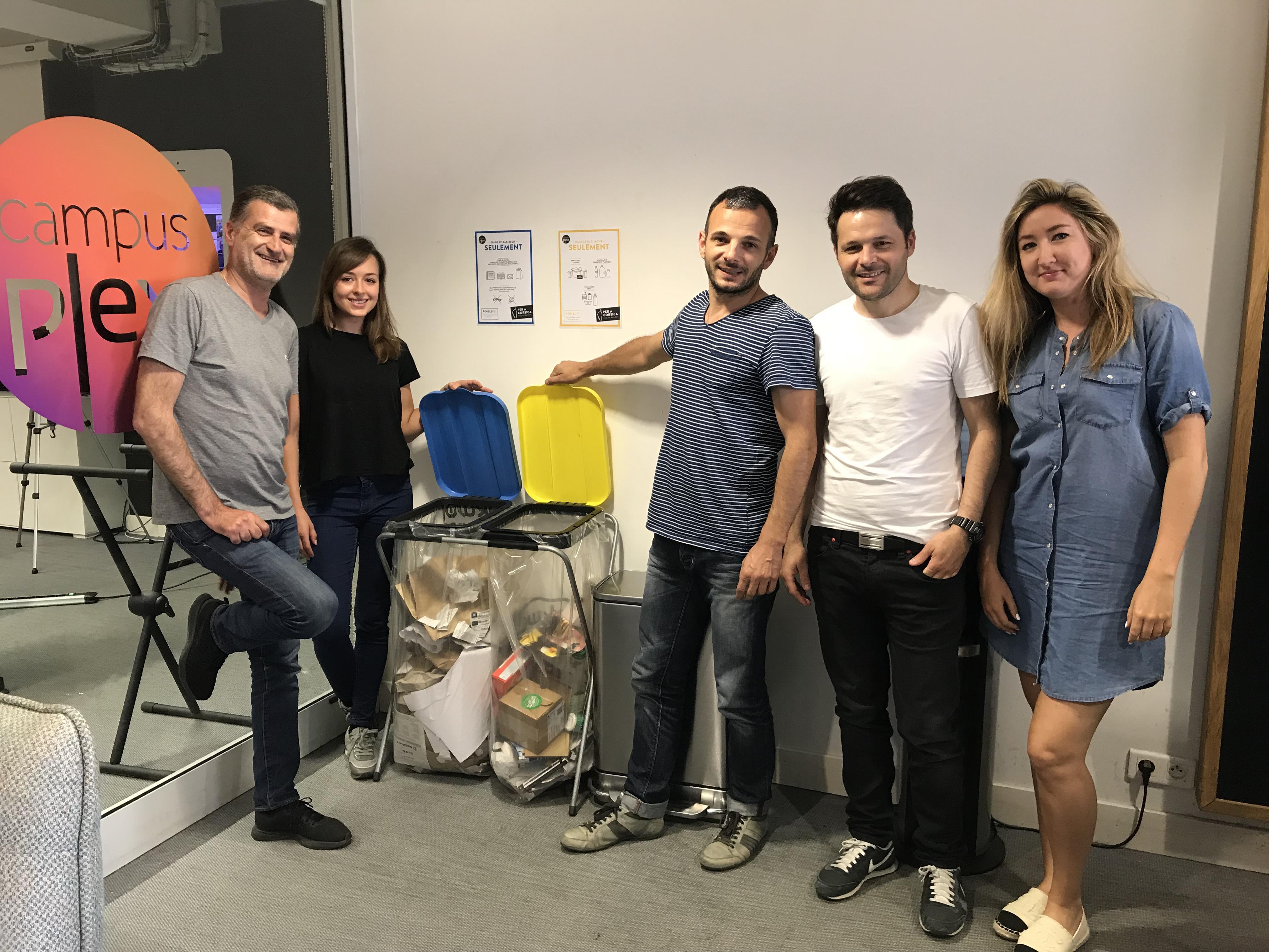 Les bureaux n’ont plus de poubelles individuelles. Au lieu de ça, nous avons des points de collectes de déchets installés à plusieurs endroits dans l'open space. Nous trions donc tous les emballages, le verre, le carton et le papier. Jérôme, notre COO, a créé des pictogrammes pour que tout soit clair. Nous trions aussi les piles et les déchets électroniques. Régulièrement, nous faisons un déplacement à la déchetterie de la ville pour les déposer.