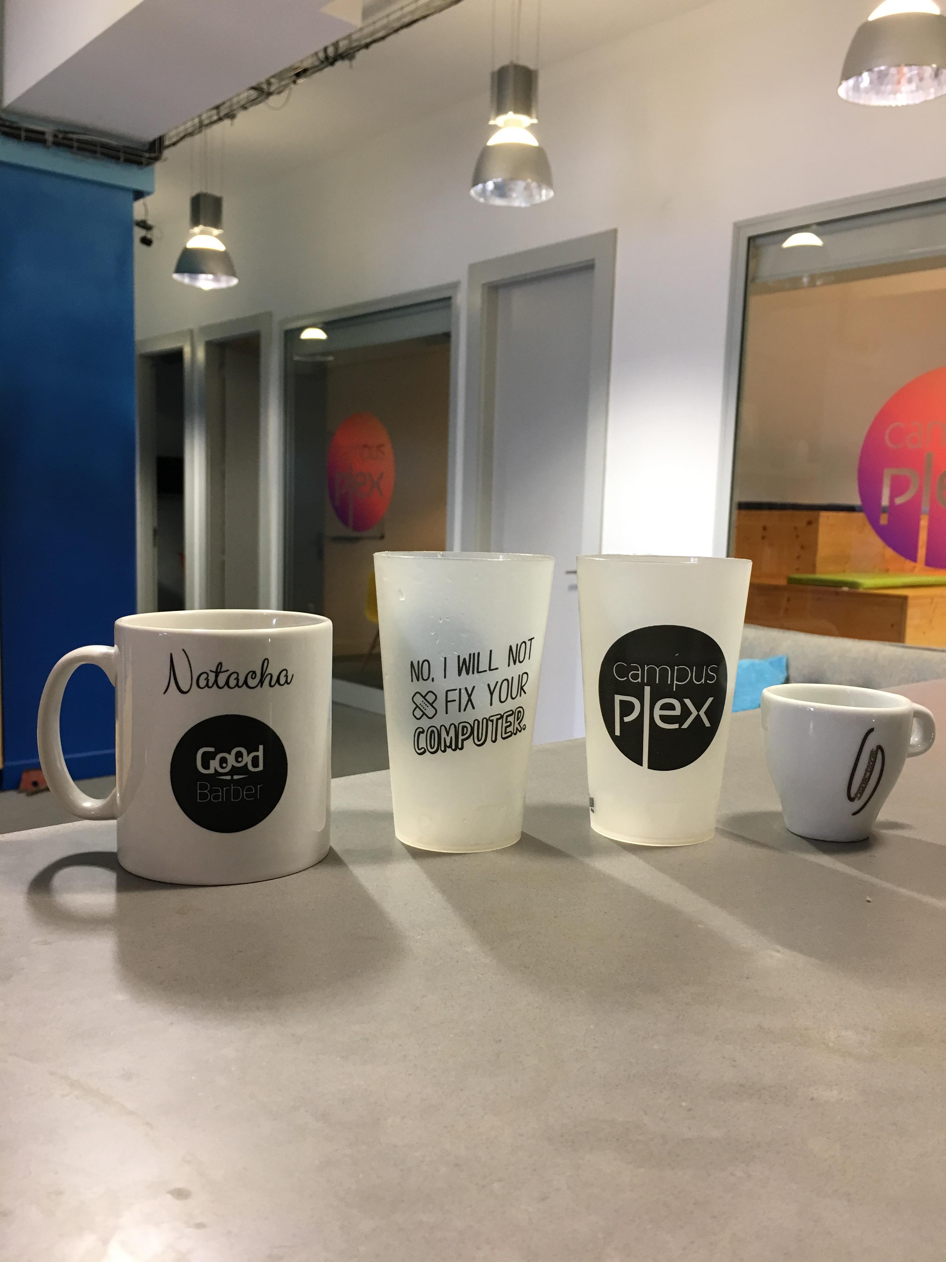 Nous n’utilisons aucun gobelet jetable pour le café ou la fontaine à eau. Nous avons aussi des assiettes et des couverts ré-utilisables pour les employés qui prennent leur repas au CampusPlex. Le café se fait dans une machine à grains équipée d’un moulin. Plus de capsules en métal ou plastique. La machine génère du marc, qui nous sert d’engrais pour nos plantes.