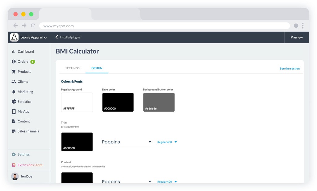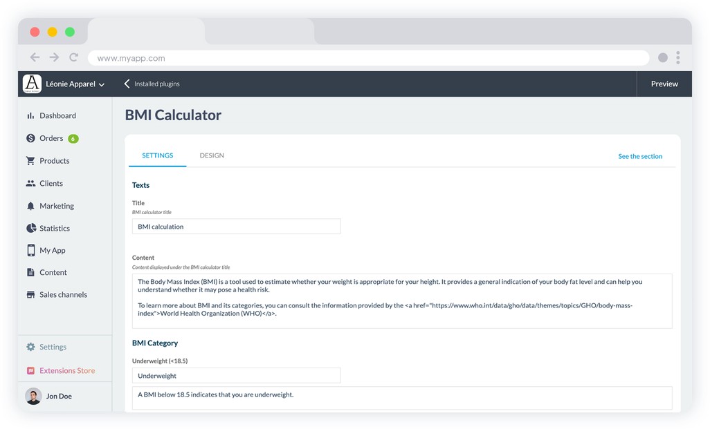 Avec l’extension IMC, vous gardez un contrôle total sur l’esthétique du calculateur. Adaptez les couleurs, les polices et l’apparence des titres, boutons, liens et textes pour créer une expérience parfaitement cohérente avec votre identité visuelle. Que votre app soit orientée bien-être, fitness, nutrition ou santé, le calculateur s’intègre naturellement et renforce la qualité globale du design. Offrez à vos utilisateurs un outil à la fois utile et irréprochable visuellement.